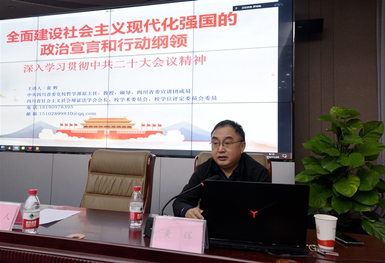 黃輝教授從黨的二十大會(huì)議基本情況簡(jiǎn)介、黨的二十大會(huì)議的主題和重大意義、黨的二十大報(bào)告全文學(xué)習(xí)解讀,二十大報(bào)告中的新觀點(diǎn)、新論斷、新思想等四個(gè)方面,對(duì)黨的二十大精神進(jìn)行了全面深入宣講闡釋。
